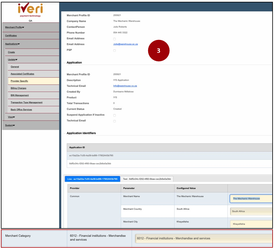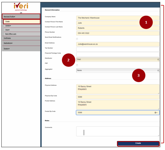 Action: Log on to: iVeri Admin website, navigate to Merchant Profile > select Create