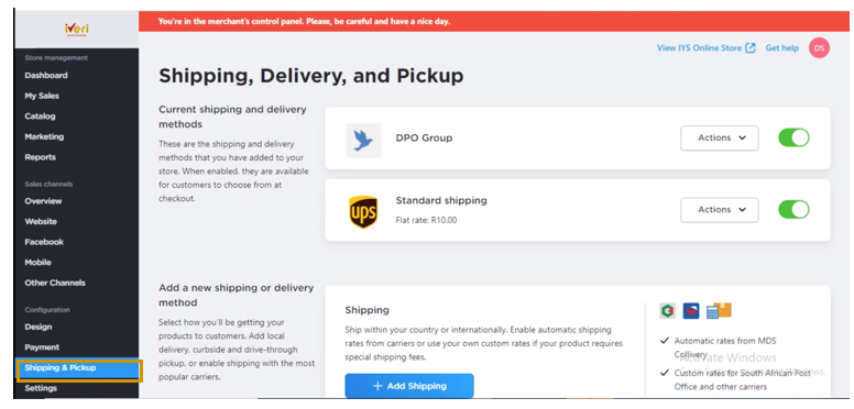 1.Use the left adjusted Menu Items, navigate to Shipping & Pickup – To set up your Shipping methods.