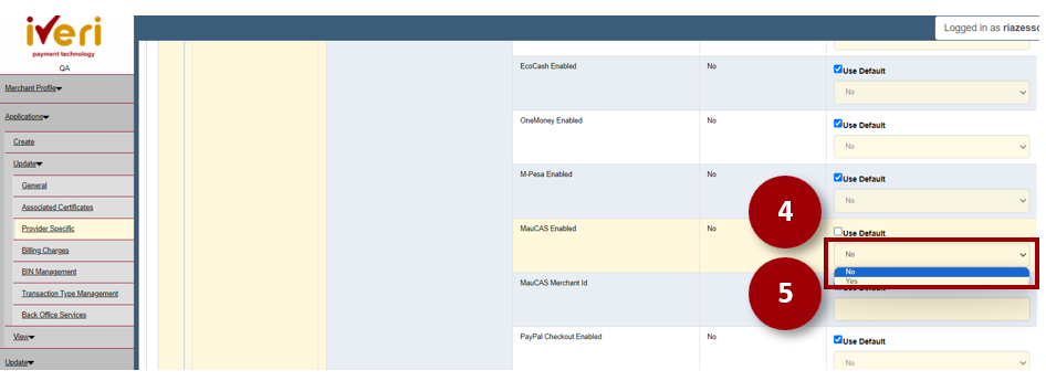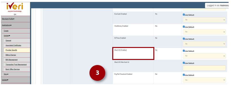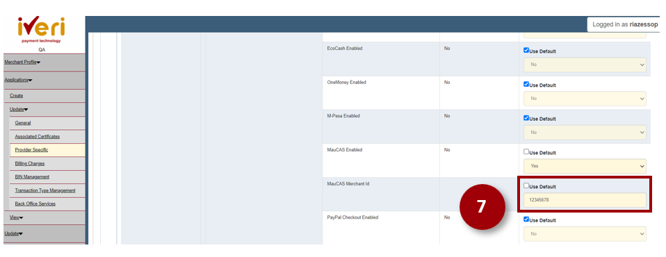 7. Untick the default value and enter the MauCAS Merchant ID.